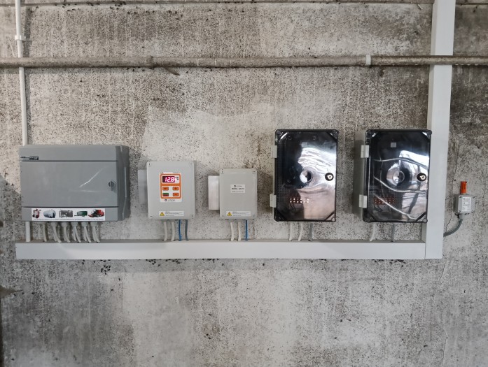 Na oborze zainstalowaliśmy także wentylatory w istniejących kominach. System wentylacji sterowany jest sterownikiem mikroklimatu. Wentylatory zapewnią ochłodę w upalne dni, a w te chłodniejsze sterownik będzie przewietrzał pomieszczenie, dzięki czemu wilgotność w pomieszczeniu będzie dużo niższa a kumulujące się pod sufitem gazy zostaną odprowadzone.